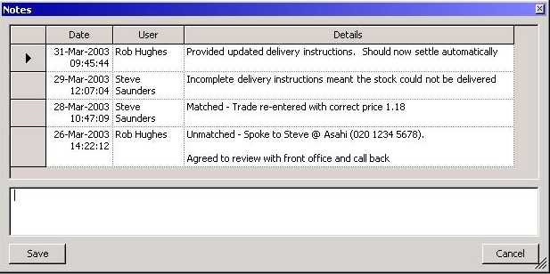 Add free-format notes against each transaction to build up an activity log. N.B. This can also include automated messaging, e.g. from Crest, Swift or Euroclear.